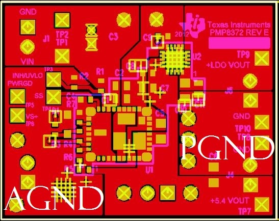4. Is it recommended to connect the area I labeled as AGND to the ground port of the power jack? Can I connect the AGND copper pour of the negative part of the PMP8372 (not pictured) to the same ground port of the power jack?