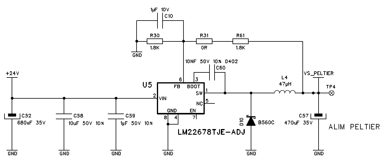 Here is my application schematic. The VS_Peltier is to supply only for the TEC. When the TEC is used, it needs a current 2A maximum. When the tec is not used, the VS_Peltier is 4.7V stable; but when the tec is cooling or heatting, the VS_Peltier is going up to 5.7V and not stable. it varies beteween 5.2V-5.9V. So then I add a capacitor 2200 uF in parallel to the C57. It becomes better, Vs_peltier goes down to 5.3V and varies betewwen 5.0-5.4V. But it stops there. what can i do to disappear the phenomenon?