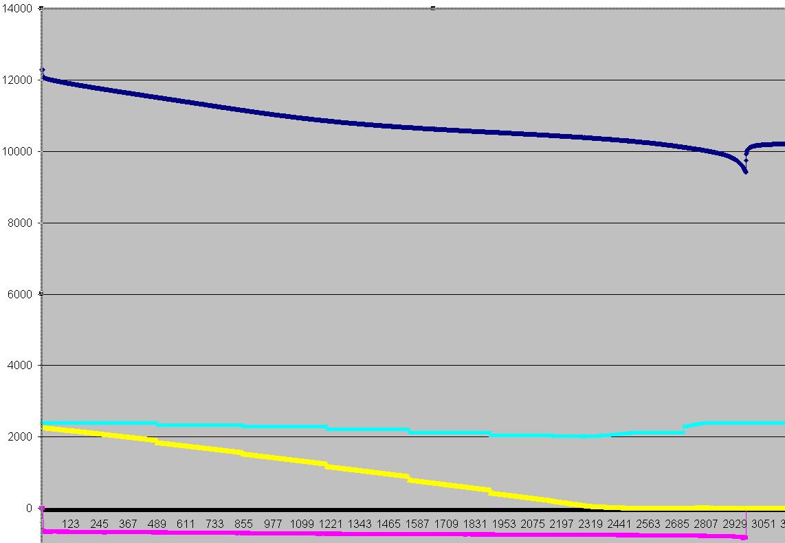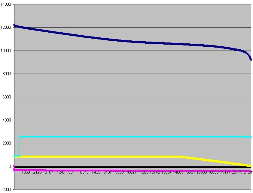This discharge cycle (blue - voltage pack , light blue - FCC, yellow - Remaining CC, magenta - current)