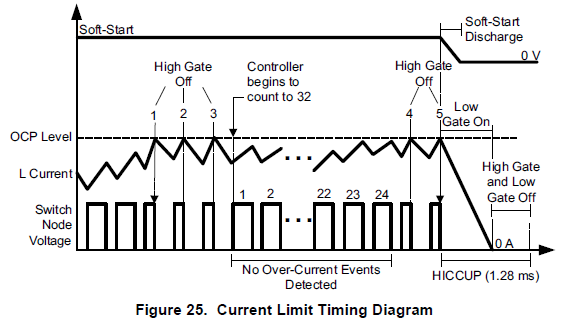 It says that the internal counter starts its 32 cycle count after the third overcurrent condition. However, the text immediately under the figure explains that it enters hiccup mode even though the 4th overcurrent and 5th overcurrent event occurs after 24 cycles. This is consistent with the text preceding the figure that says that the counter begins from the first event and that the device enters hiccup mode as soon as it detects 5 events in 32 cycles.