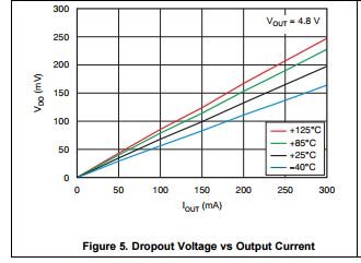 As a result, the amount of headroom required will depend on the application's output current. Per the dropout curve, TLV702 is appropriate for a 200mV dropout with currents less than 250mA.