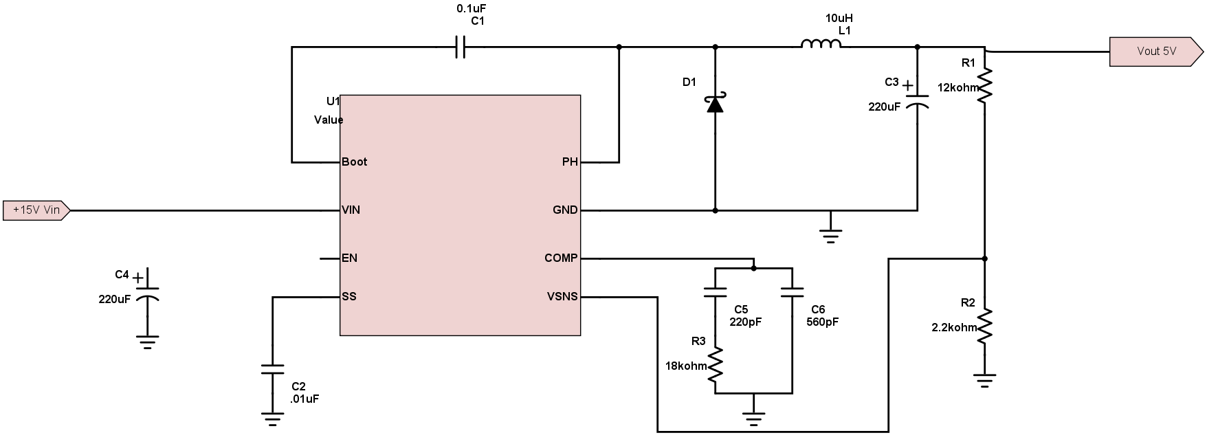 We have a 15V power source (LIPO battery) that we need to regulate down to 5V to power a BeagleBone Black (BBB) board. Currently, we are testing the circuit with simple power resistors as our load (so as not to damage the BBB). We designed the circuit according to the datasheet and get a clean 5.2V unloaded output. As soon as we connect any kind of load (tested at 42mA (120ohm) and 1A (5ohm) loads) the output gets loaded down to anywhere from 0-3V. In any case, it is clearly not capable of sourcing the required current. Relevant components listed below: