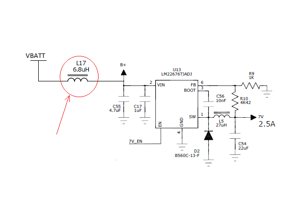 In an old design, there is an inductor in front of LM22676. Most likely for EMC purpose. We see damage (burnt) to LM22676 and suspect voltage spikes when power is interrupted. Any suggestion please? Some capacitor values are also questionable.