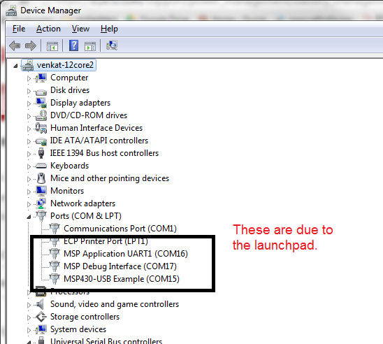 The launchpad is working fine as I ran the "blink" example and it worked. I also installed MSP ware and USB drivers, so the launchpad populates three COM ports as shown in the attached image.