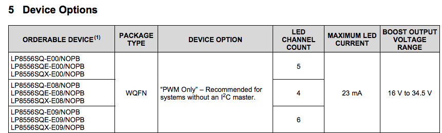 But, changing register values for EPROM on user site is just for test purposes because each version of LP8556 is tested for its own settings on production line, which means that using one version for mass production after changing the register values is not guaranteed for the quality of the devices. I recommend you to use correct versions for your application conditions.