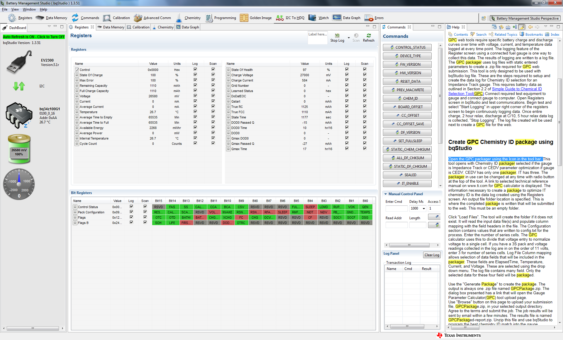Starting the logging of the registers worked after some attempts (the logfiles were not always created, but bqStudio said it is logging :( ).