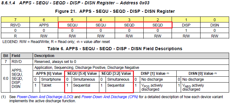 I believe enable timing of Vpos and Vneg can be set independently by ENP pin and ENN pin.