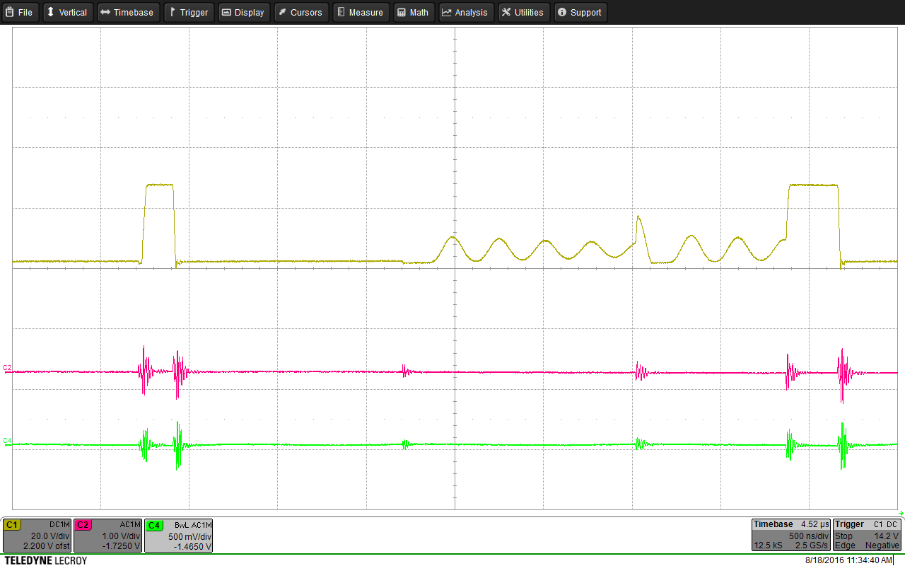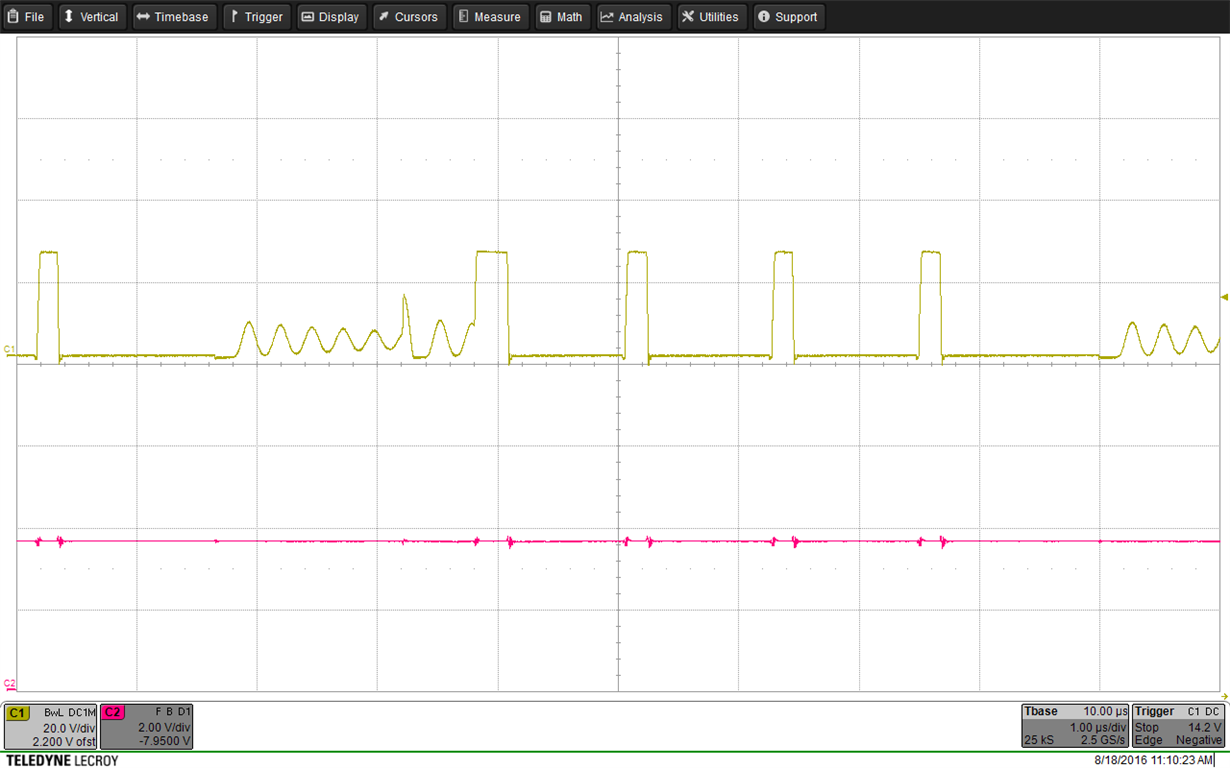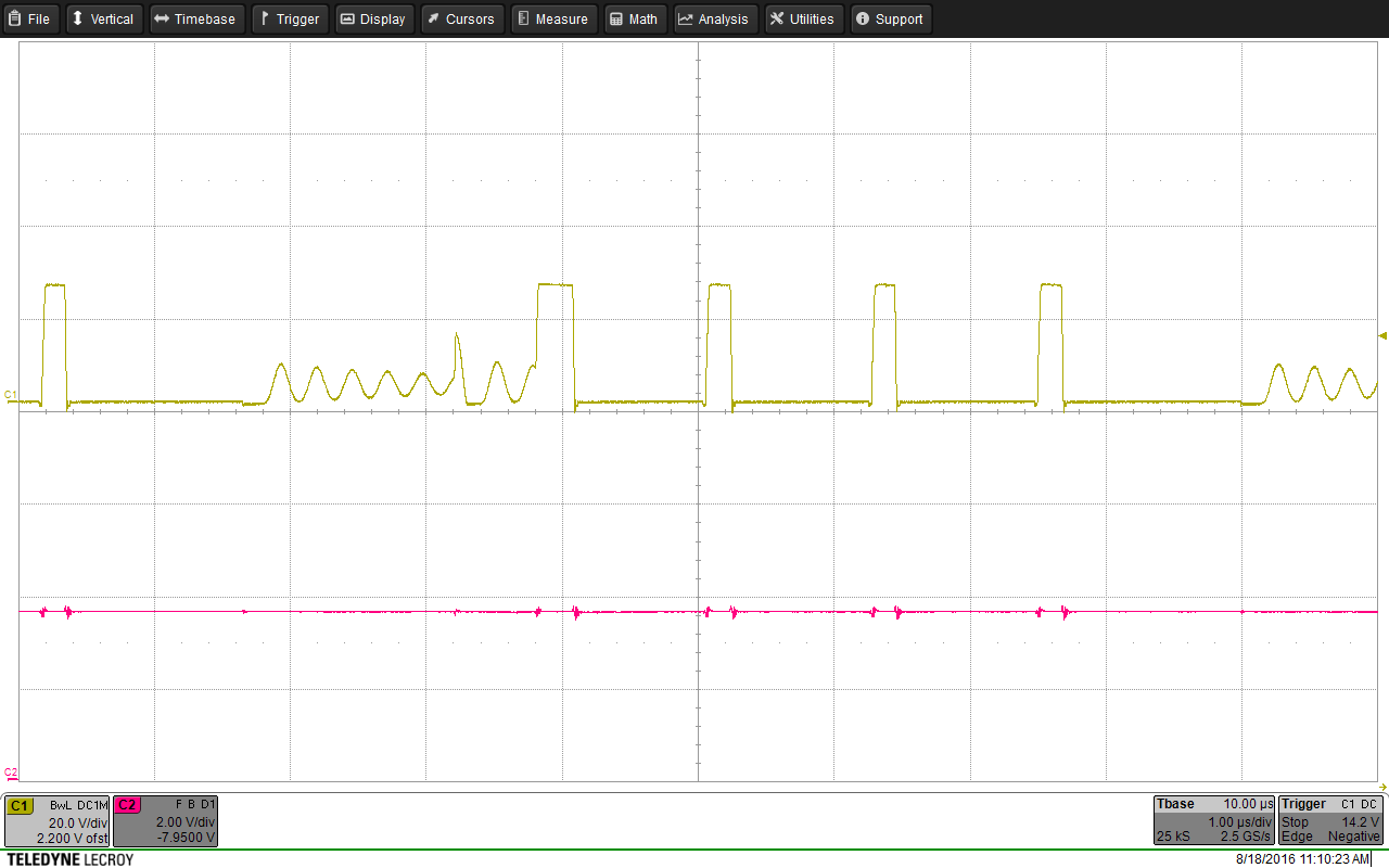This picture shows that all of the "real" PWM events are in sync with the programmed clock frequency. Because this is in discontinuous mode there is some pulse skipping. The errant pulse is shown in both pictures and does not match the clock period. Do we understand this event?
