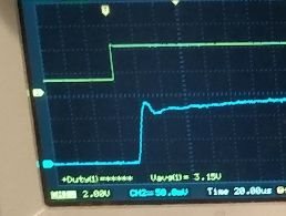 Startup example after some 1-2seconds pause between PWM enable: blue is current (100mV = 1A), yellow is trigger (actual PWM will be high after 20uS of trigger high...)
