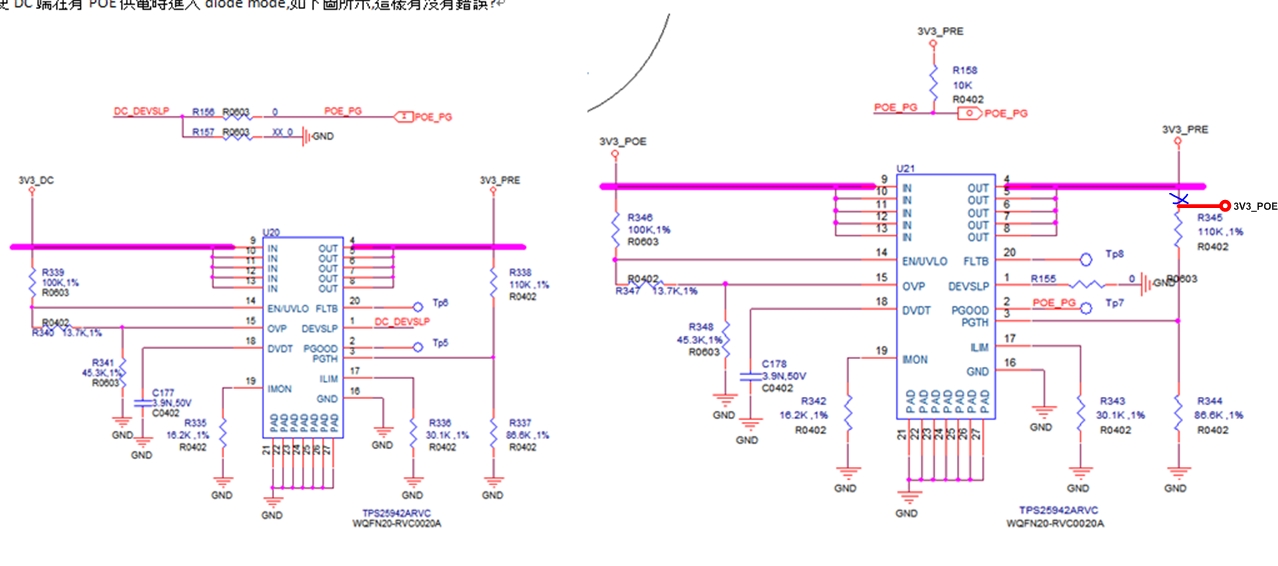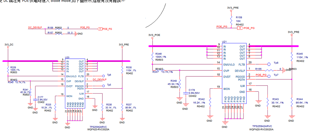 Currently my customer use TPS25942A implement ORing control for POE, please help us comment this schematic, thanks.
