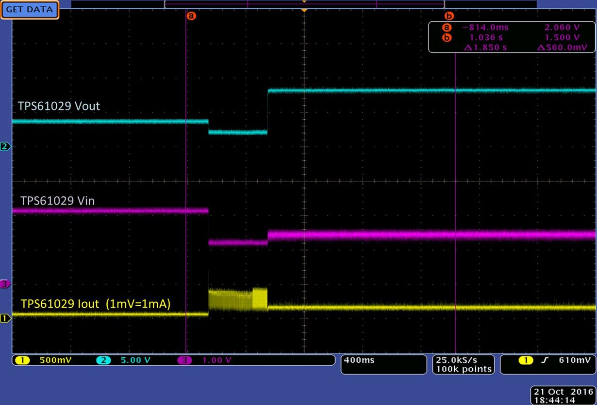 Hi, we are using the TPS61029 with the output voltage set to 3.3V but have encountered a situation where the output voltage jumps to 8V. The plot shows the input voltage, output voltage and load current. As you can see, when the load current spikes the input voltage drops (we are running of a simulated battery using a benchtop supply and series resistance) but stays above the 0.9V minimum. After the period of higher load current the output voltage jumps to 8V and stays there. What could be causing this behavior?