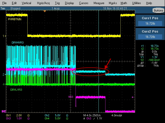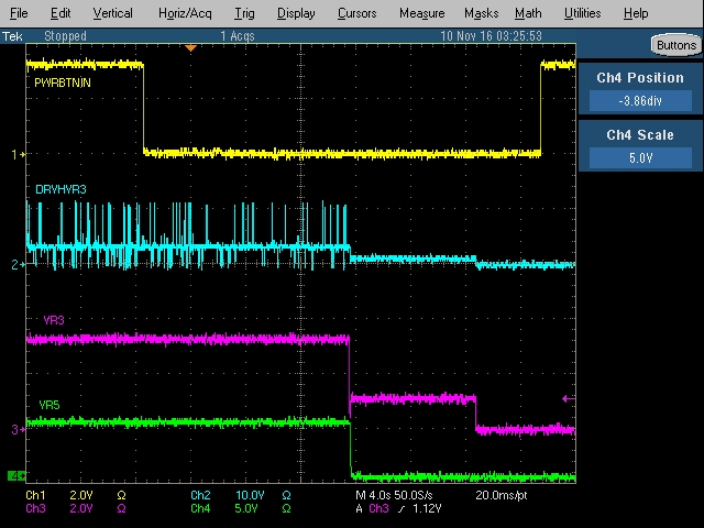 Now customer configure FLT timing to 15sec for forced off timer on PWRBTNIN. When the timer expires, they found VR3 is turned off as a 2-step curve, but other rails are turned off immediately. (Please check the scope shot as below.) Please let us know your comments if this is normal or not?