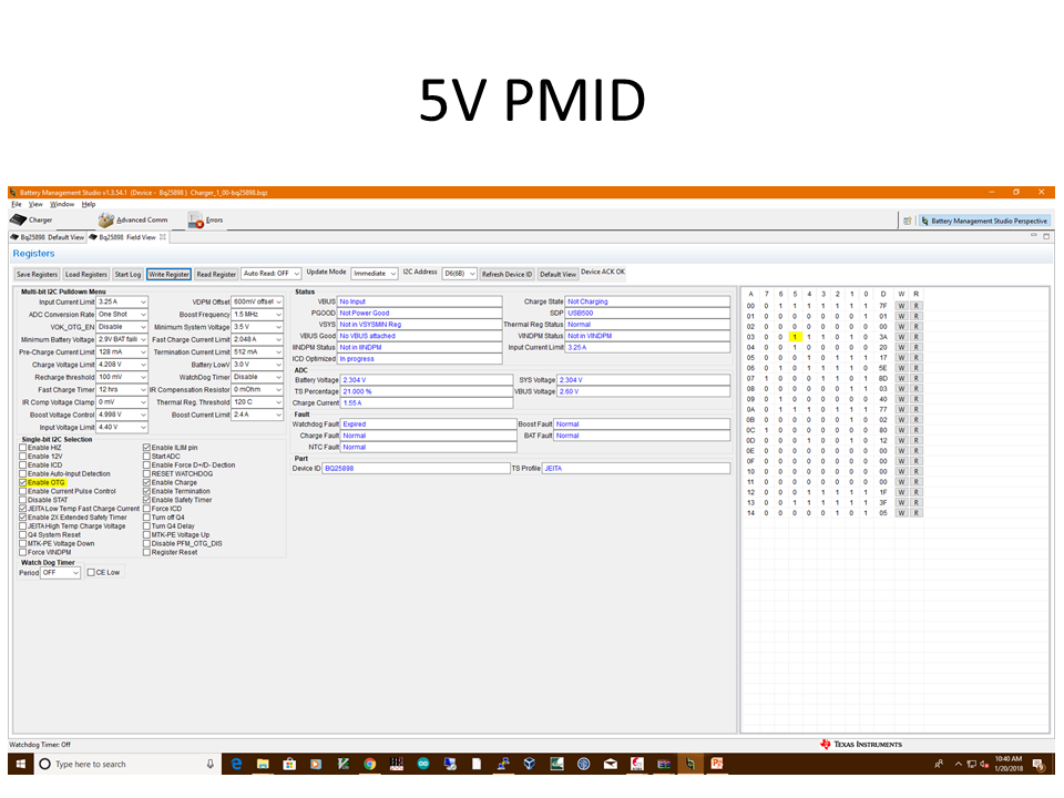 1. When I check Enable OTG in "battery management studio" tool, I get 5V but as soon as I connect a load (10E, 20W resistor) to this pin, it drops to 2.5V giving only 250mA current.