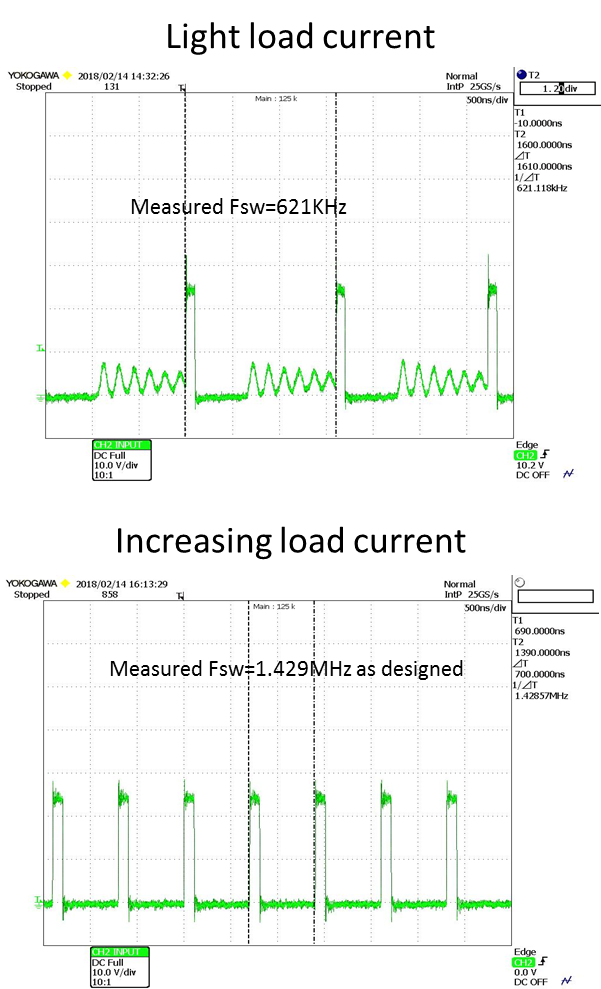 Because we got the result of being decreased switching frequency in DCM with RT=11.5Kohm.