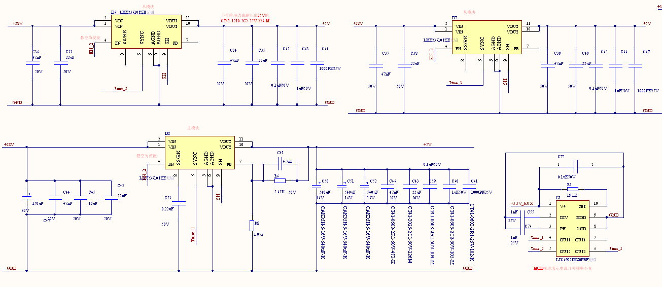 Secondly, from the schematic, I didn't see any bulky output capacitors. The datasheet states that a minimum value ranging from 330 μF for 6-VOUT to 660 μF for 1.2-VOUT applications is required based on the values of internal compensation in the error amplifier. And when you do paralleled output, the current sense gain of the entire system increases according to the number of modules slaved to the master. To compensate for this and ensure good stability, the total output capacitance has to be increased.