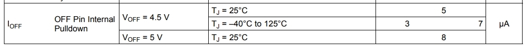 We are going to calculate the pull up resistor at OFF pin. The pull down current is defined as below,