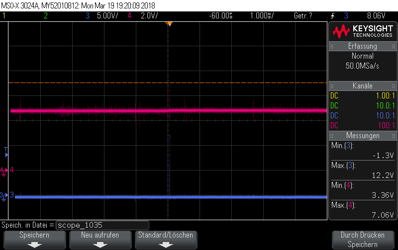 A.) VDD pin to GND_ISO (blue) and DRV pin to GND_ISO (red), with 100 ms/div and after that: zoomed in/retriggered with 1us/div