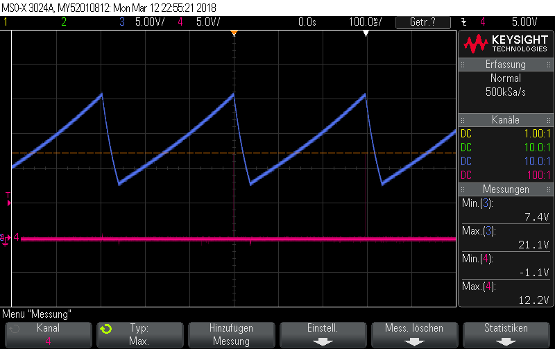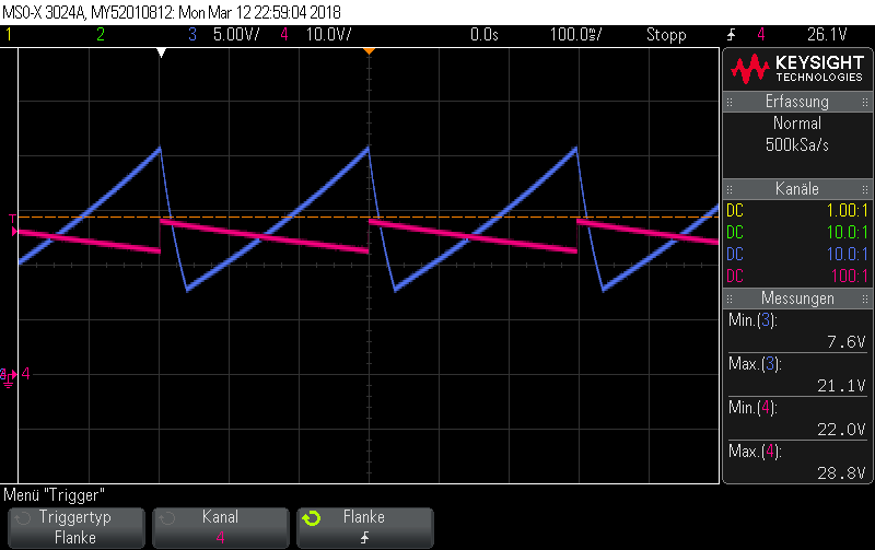 B.) VDD pin to GND_ISO (blue) and VP500_ISOWAE (output pin) to GND_ISOWAE (red), the two initially isolated Grounds being connected through the oscilloscope - no 500 Volts here, but 22.0 to 28.8 V.