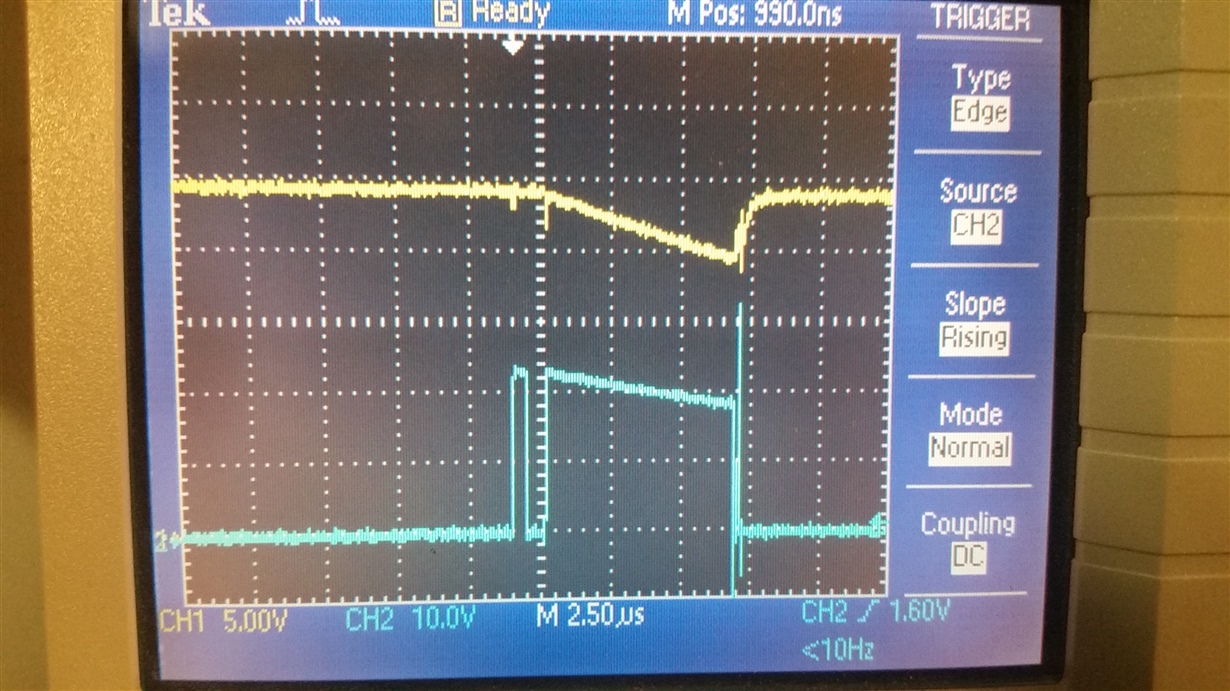 Yellow trace is Vin (24VDC) and blue trace is the high-side FET gate.