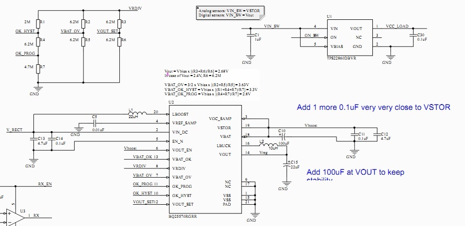In my circuit, the BQ25570 will be used to charge a supercapacitor for later use and manage a switch to supply power to the load. When VSTOR = 3.3V, VBAT_OK = 1 and the switch closes, VSTOR is supplied to the load. I need a supercapacitor to store the harvested power for later use. So, could you please recommend me another configuration of BQ25570 that still can store the harvested power up to a sufficient power but with faster time? Is if better if I do not connect VSTOR to VBAT, and use VBAT to charge the supercapacitor instead? Thank you very much.