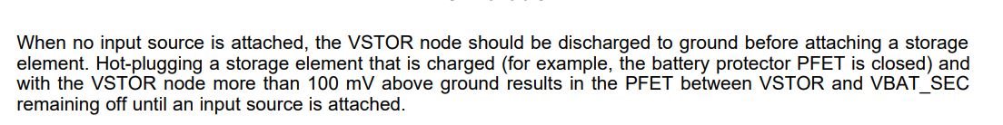 With the solar panel obscured, we plug in the battery and the system started fine, but then we removed the battery and plugged it in again - no good. VBAT_OK was 0 and BQ output hovers around 450mV, slowly going down to around 65mV. If we somehow "discharge" the BQ output (either shorting it or waiting for it to slowly discharge) before plugging back in the battery, the systems works fine.