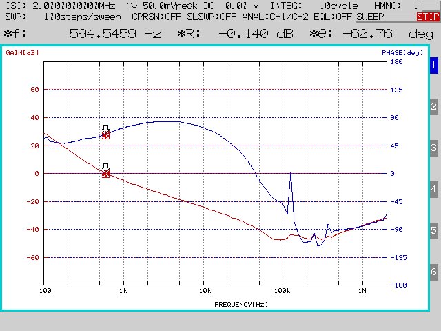 I replaced R16 to 1kOhm in order to make the output voltage to 5V. Changing the output voltage, the phase/gain margin may change, so I measured those margin by FRA by putting 50Ohm resistor on R8. The result is like the below: