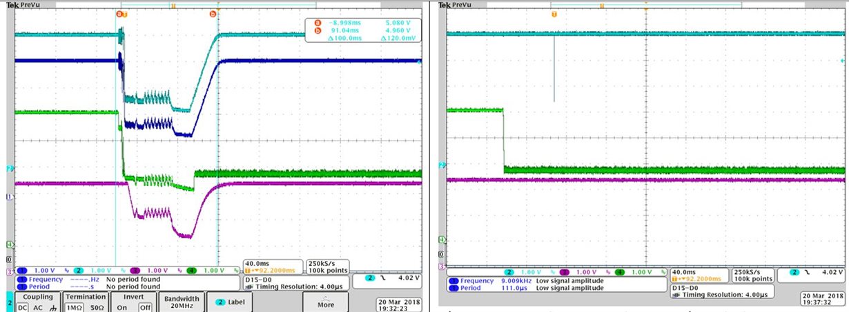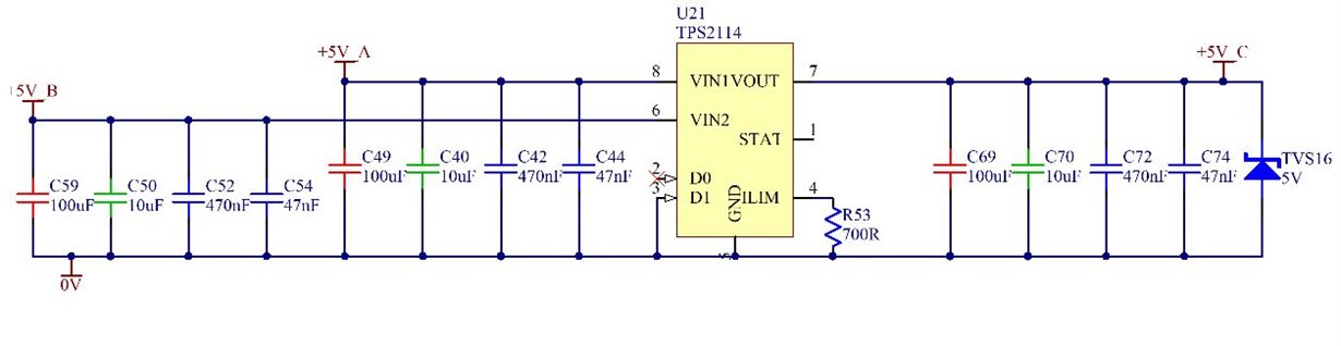We only see this problem sometimes when the input supplies are at a similar voltage and the output of the TPS2114 is suddenly loaded beyond the current limit. We don’t see this loss of current limit if one supply is 3V and the other is 5V for example, only when both are at 5V.