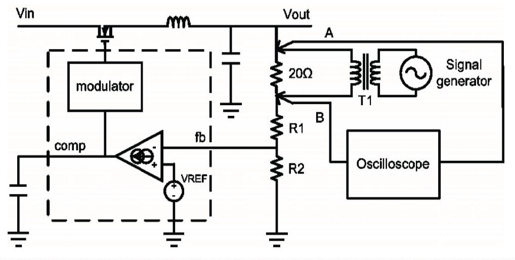 I want to know if I make loop stability test on tps54625, then my Signal Stimulus should be injected to where? As we know the test equipment usually have 3 probes (the signal stimulus, the input signal detect, the output detect signal) like the diagram blew.