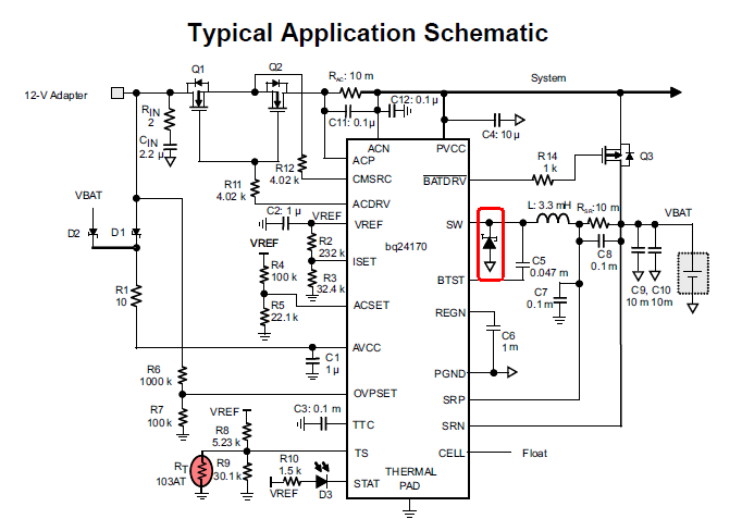 In datasheet, there is a schottky diode on SW pin (page25,28,29 except for page30), especially in case of connecting AC adapter.