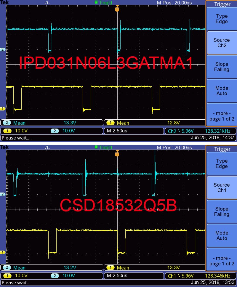 I used IPD031N06L3GATMA1 MOSFETS in a buck and bust leg. Ciss 10 000 pF; Qg 59 nC.