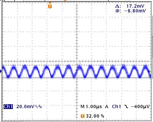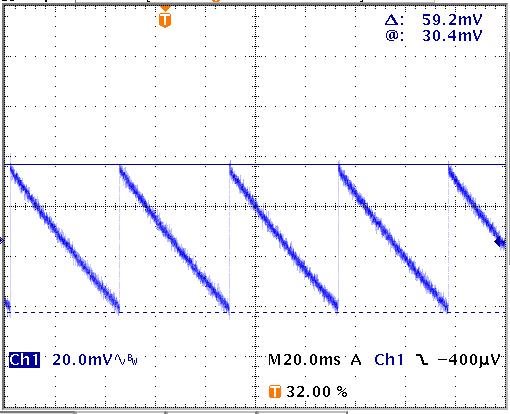 At higher load the ripple is lower compared with light loads or no load. The picture below shows the ripple without a load (this is a +5V supply for external devices). In that case I get a relative high ripple of 59mV at a very low frequency (42 msec). However of course this is not a practical use because normally there will be always a load when using this supply.