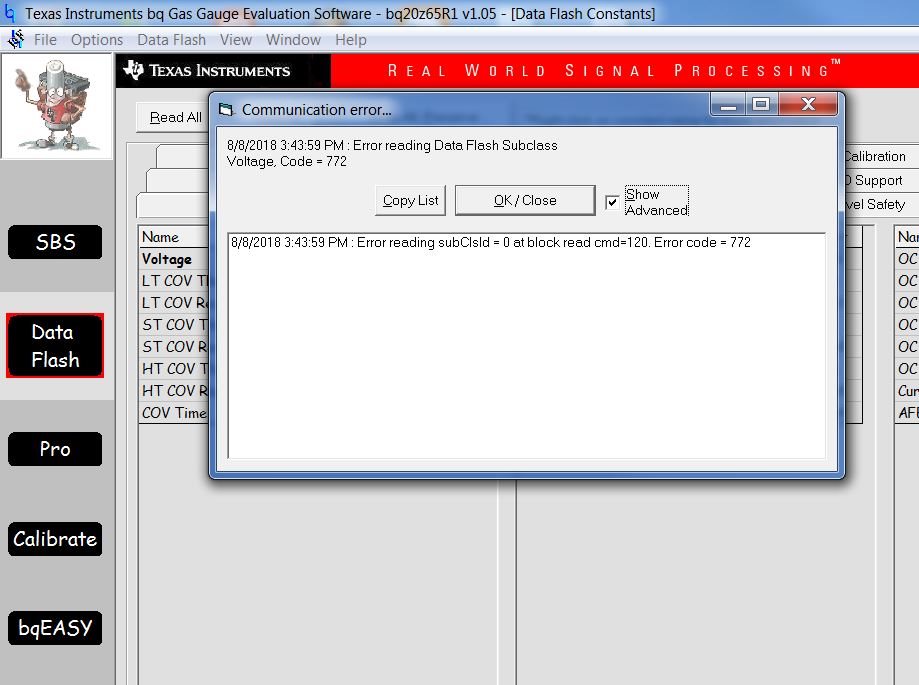 I have a EV2400 connected to a battery pack that uses the BQ20Z65 fuel gauge. I'm having no luck displaying the Data Flash.