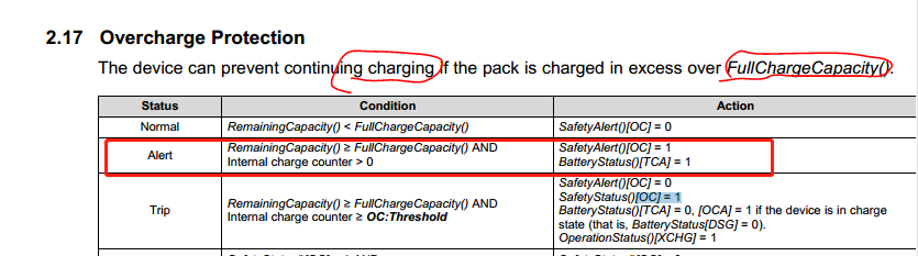 During the charging process, the RSOC has not reached 100%, and the FC TC has not been set. Why is the OC set in advance? As shown in the second picture, the condition of RC >= FCC is not yet met. Why is the OC set information already mentioned in the TRM?