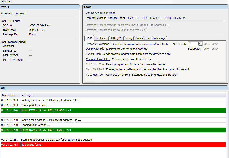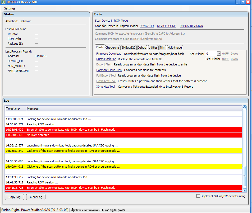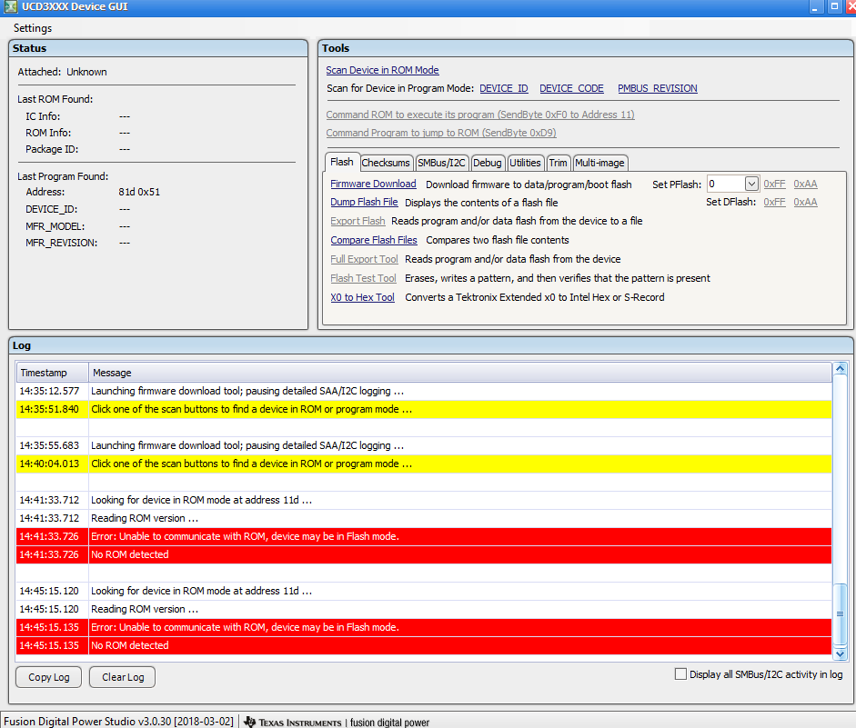 when I put the USB , it's okay the LED is on , But when I use Device GUI it say that no rom detected unable to communicate with rom , device may be in flash mode .
