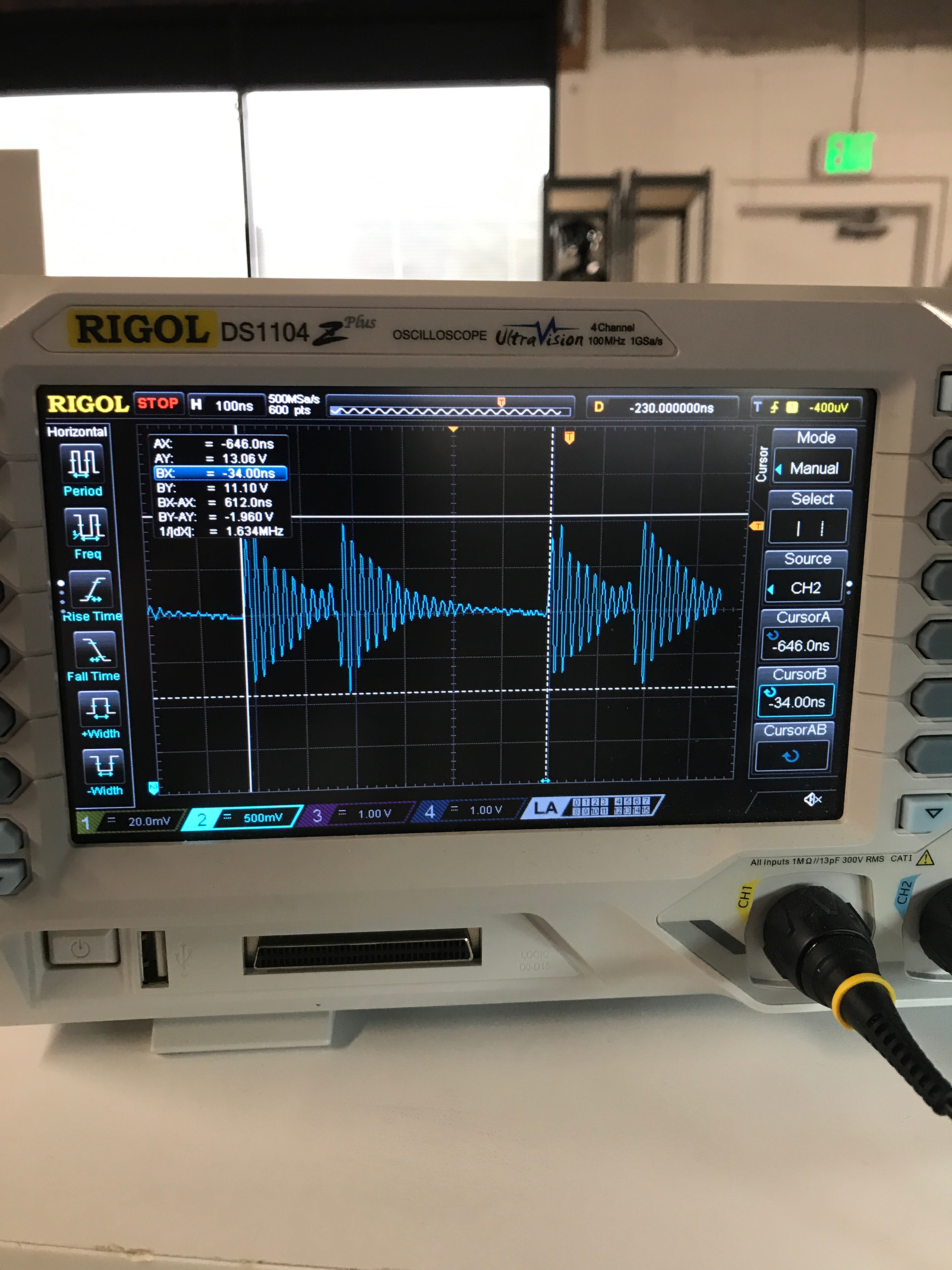 CH1 (yellow) is VBAT. CH2 (blue) is the 12 V adapter. Purple is the MATH channel doing a difference between them.
