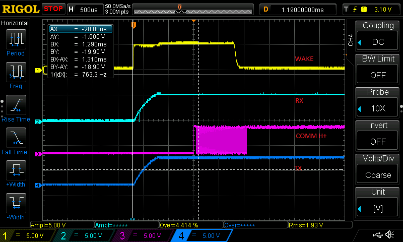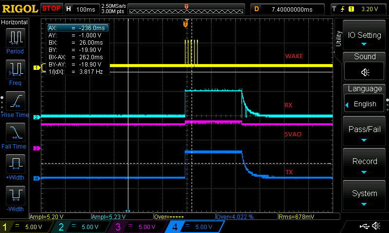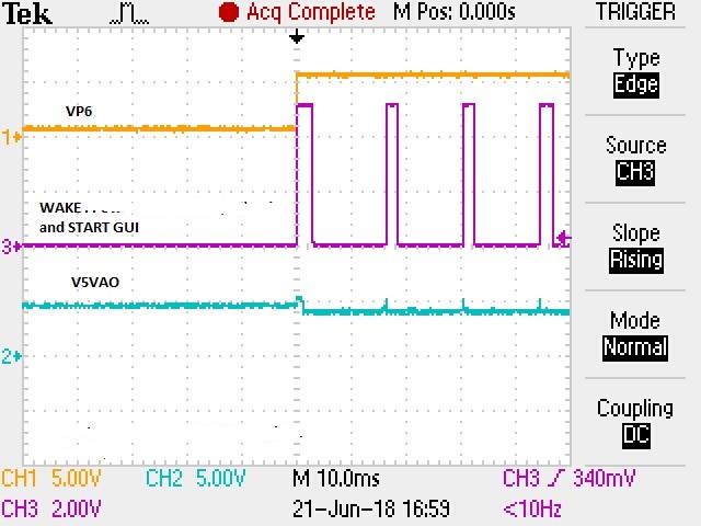 When we start communicating with via the GUI from the EVM we see 1 byte is transmitted and immediately the battery monitor is shutting down. We now have to send a wakeup pulse again before we can retry. Each retry gives the same result.