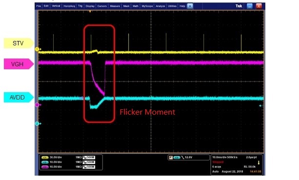 1. After measurement, the VGH voltage power down and the screen become black, and the duration of the screen flicker is consistent with the duration and frequency of voltage reduction, as shown in the figure;