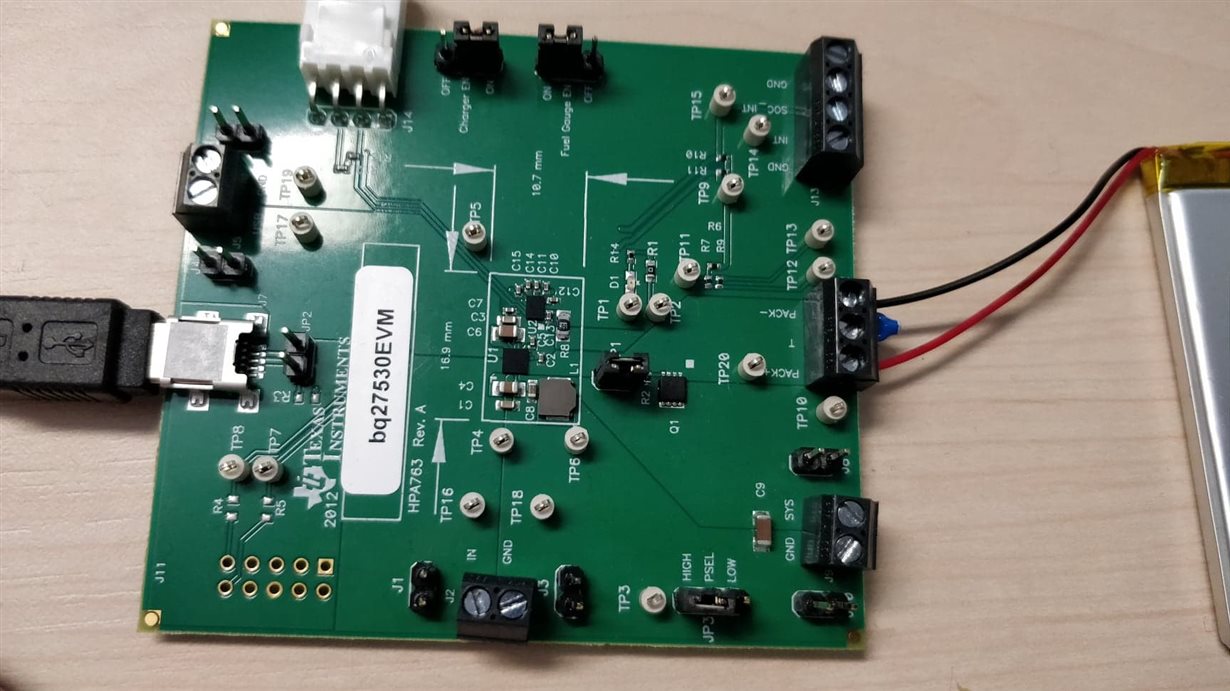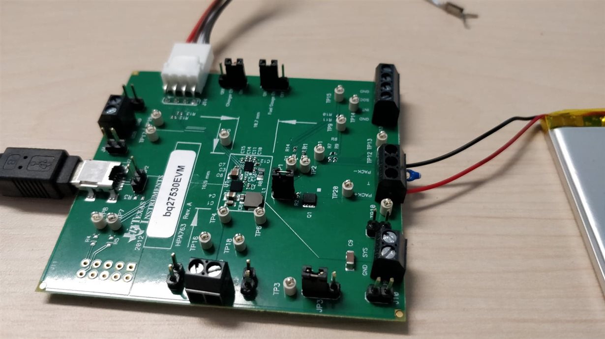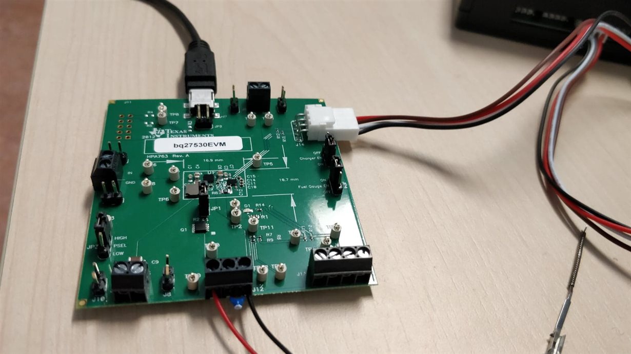 I'm using the BQ27530EVM board along with the EV2400, bqstudio(1.3.54.1) and a 1400mAh battery.