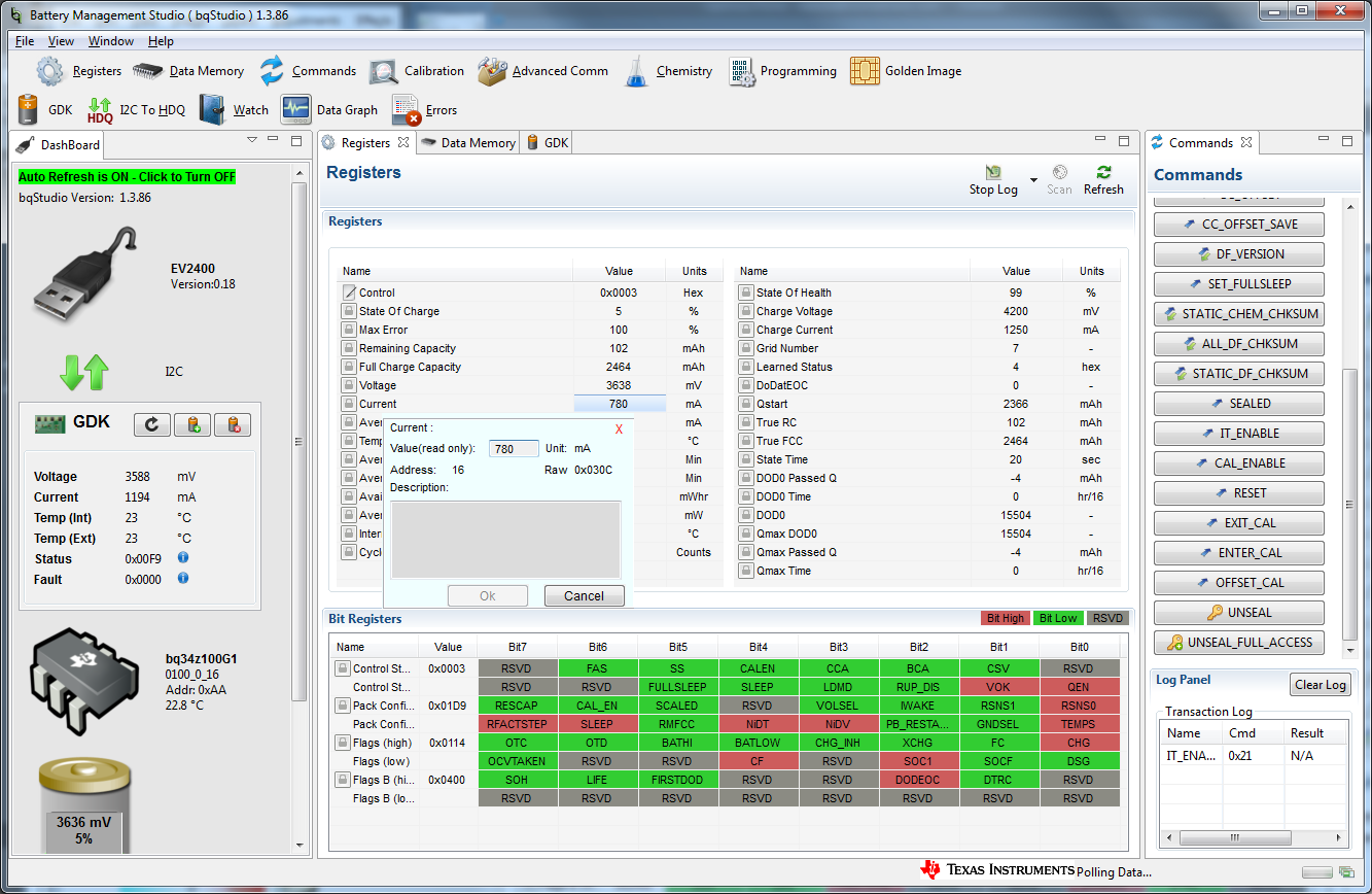 I am attempting to follow the instructions in sluu904A for the bq32z100EVM and slua334b for preparing optimized flash constants. I am using the GDK to charge and discharge my batteries but the current reported through the GDK interface does not match the current reported by the gas gauge.