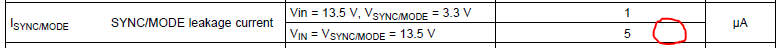 How much is the maximum SYNC/MODE leakage current? They don't need quarantee. They will use it as reference.