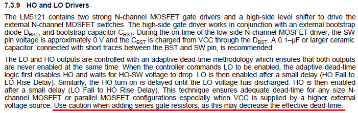 My customer saw overshoot and oscillation at LO pin so considers to put gate resistor between LO pin and Nch FET(CSD18543Q3A).