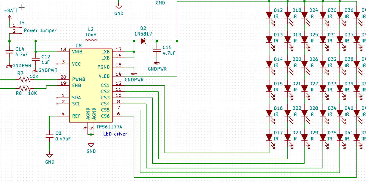 I'm working with the TPS61177A LED driver chip in a prototype and I'm running into a strange problem. As the thread title above states the chip isn't putting out the expected current. I'm measuring the current at the cathode side of D2. I'm not using the I2C features so the chip should default to 20ma per CSx right? The voltage at D2 looks correct at 11.87V. I'm not 100% certain that the chip is soldered correctly since this is a prototype that I soldered in our small reflow oven.