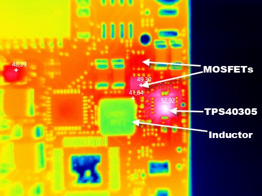 We were able to get a picture from a Thermal Imager and as soon as the card is powered, the TPS40305 gets hot. The inductor doesn't appear hot on the Thermal Imager but heat is produced from it. Ambiant temperature is at 25C.