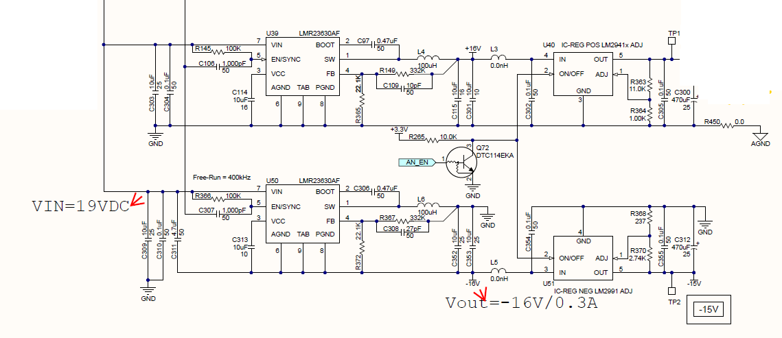 We are using LMR23630 as an inverting buck to generate a negative voltage schematics as below. When L6 use 100uH audiable noise heard from inductor L6. If change the L6 to 33uH the auiable noise disappear.