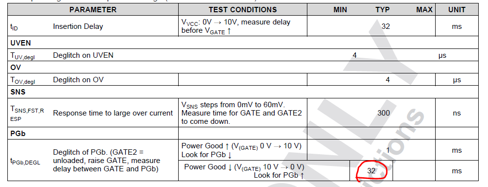 and when i do the test of turning off the power, find the below figure,yellow is the pgood and blue is the drivew.when gate 10V-->0V, but PGb delay 30ms? why ? can we decrease the time, for we want to use it to do the design of the input signal.