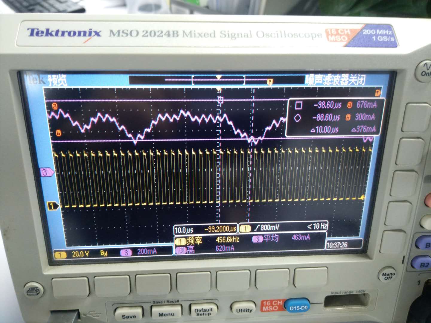 Measured waveform,Channle 1 is Mos drain waveform.Channle 3 is 12V output current waveform.