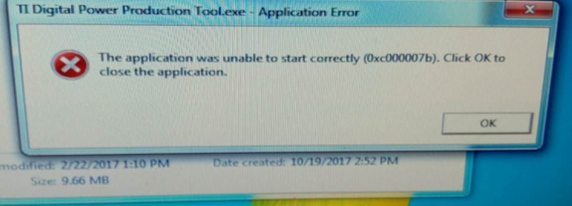 Please do a web search with the same error "The Application was Unable to Start Correctly (0xc000007b)" It appears it may be related to a windows upgrade. There are a number of suggestions. Some include running as an administrator, or reinstalling /repairing the .NET framework. There are a few ways to repair the .NET framework. I found a repair tool on Microsoft. www.microsoft.com/.../details.aspx please give that a try.