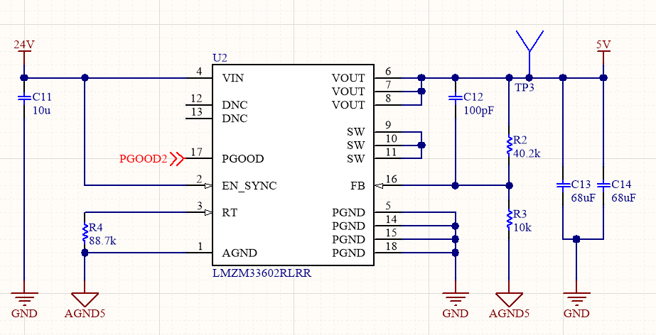 I have created a PCB using the LMZM33602 but I can't get it to output the 5V and I was hoping someone could look over my schematic/pcb do see if they notice anything odd. I am attaching both documents. Thank you!