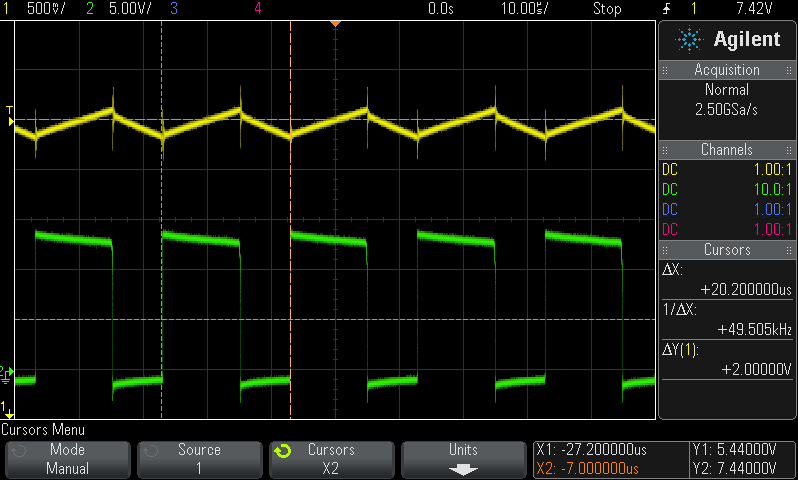 The lab reading shows the switching frequency of the device to be around 49-50 kHz in any load condition it is tested (checked for 500mA - 1.2A). 2 Test reading snaps given below.