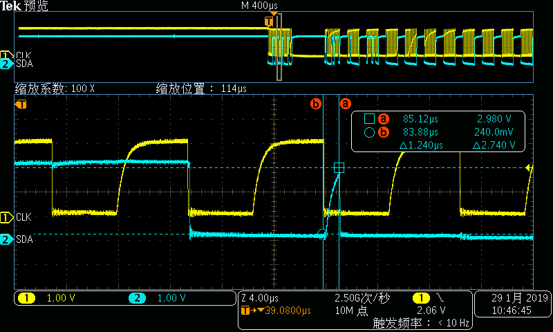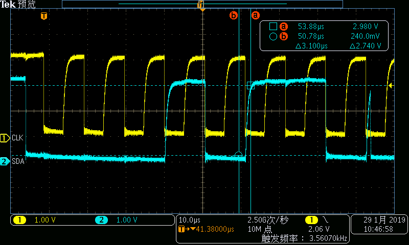 When i measure the BQ40Z80EVM-020 SMBus waveform,i found the wave on SDA was abnormal,the waveform as follows,SDA waveform with a spike,what are the causes of this?